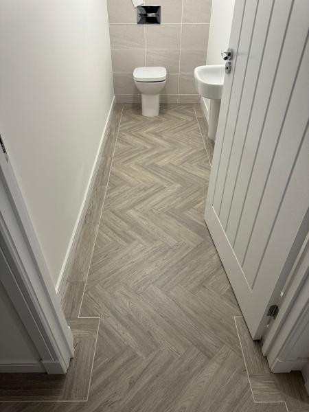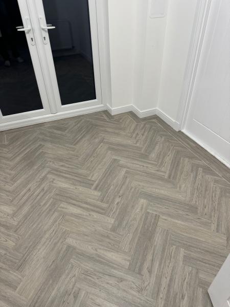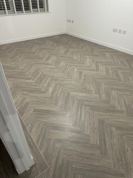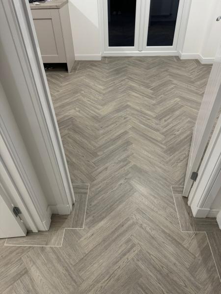 New build installation. We supplied and fitted Amtico First colour Heron Oak to this new build home, the customer opted to have it laid 4x18 parquet effect with border feature and 4mm Dew stone stripping feature. This was laid to the full ground floor of the home. We prepared the subfloor with a prime and screed. Beautiful.