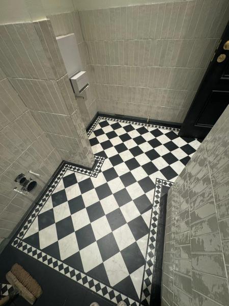 Some pictures of an installation carried out last week. - Amtico Signature Check design in colours Graphite slate and Bianco Classic Marble, with bevelled diamond border and Graphite Slate border. Beautiful!!