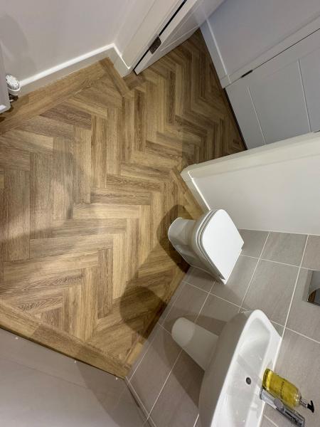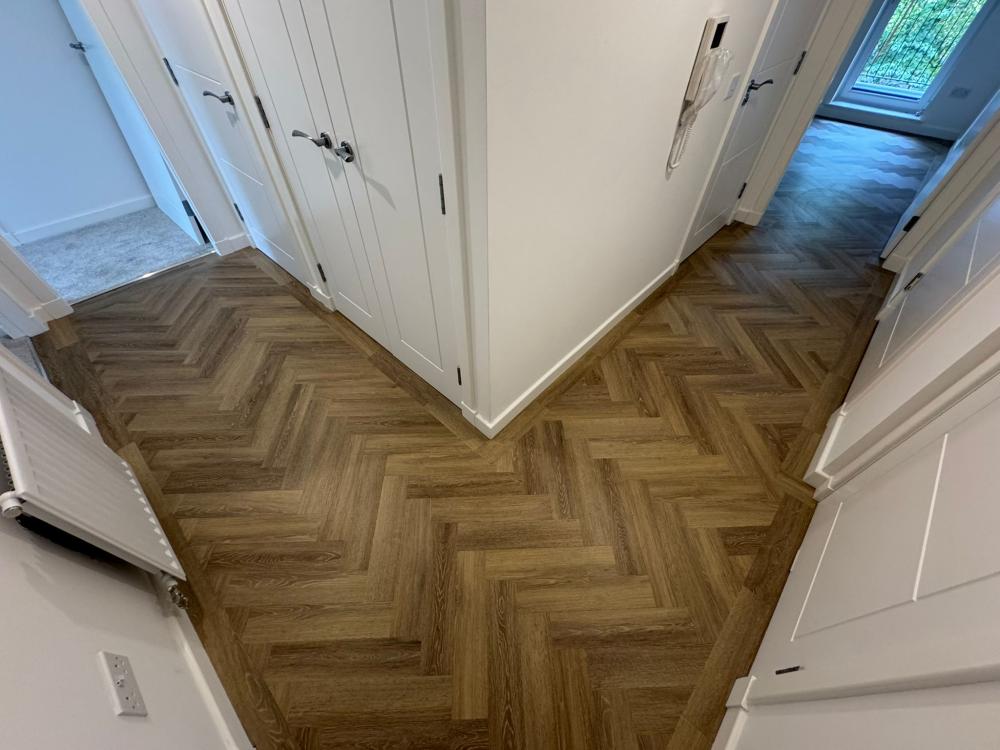 Here are a few snaps of an installation we supplied and fitted to a new build flat last week. We prepared the subfloor with a 6mm plywood. Beautiful. *Amtico Spacia, Mulled Oak, 4x18 Parquet with border feature.