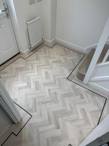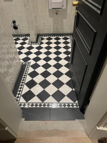 7th of October, 2025Some pictures of an installation carried out last week. -Amtico Signature Check design in colours Graphite slate and Bianco Classic Marble, with bevelled diamond border and Graphite Slate border. Beautiful!!